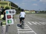 校庭に横断歩道や信号機、交差点を用意し、自転車と徒歩に分かれて基本的な交通ルールを確認しました。