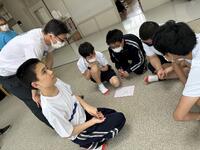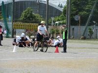 校庭に、横断歩道や信号機、ジグザグな通路を用意し、通学に自転車を使用している生徒は、自転車で走行し、交通ルールの遵守について確認しました。通学で自転車を利用していない生徒は、徒歩にてコースを体験し、横断歩道の渡り方等を、確認しました。皆、真剣な表情で取り組むことができました。