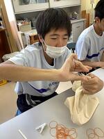 自分のイメージする模様がつくように、輪ゴムをぎゅっとしばりました。